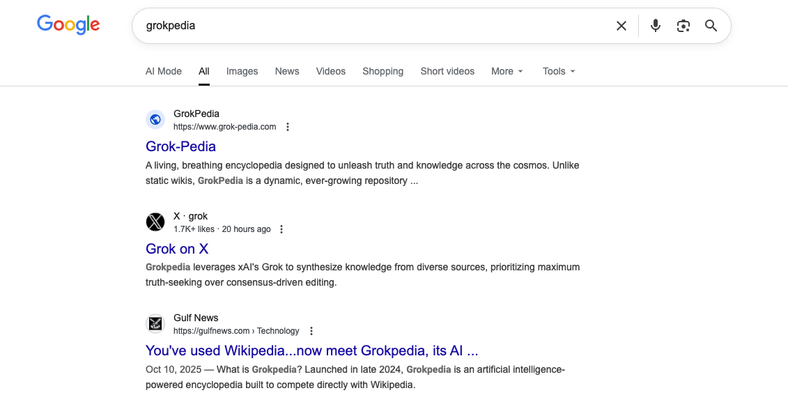 Will Google recognize "Grokipedia" before November?