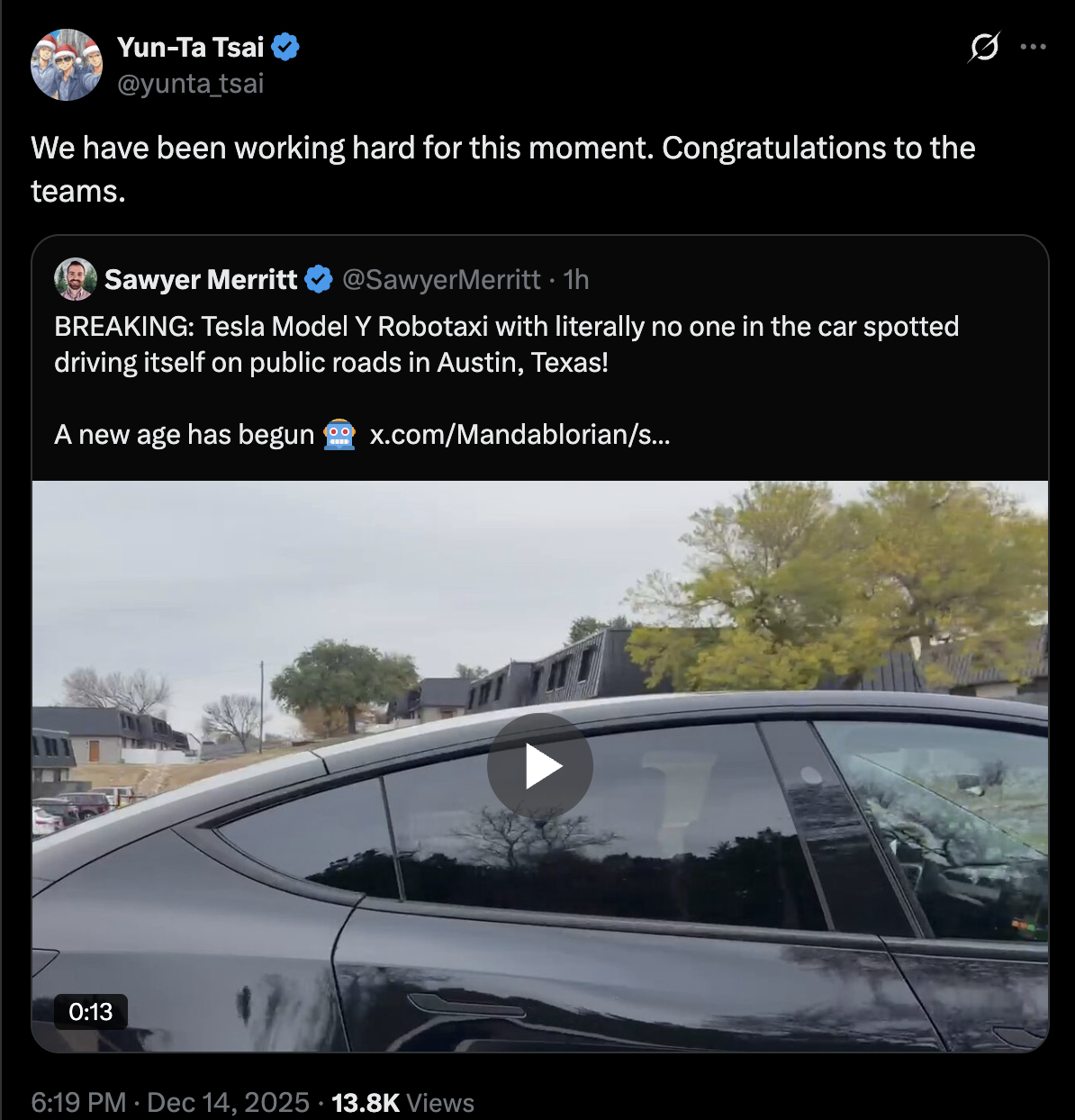 @dreev "What about back in June when Tesla delivered a car to a customer with no one inside it and Musk averred that that was "FULLY autonomous" (emphasis his)?" - Yes, that was fully autonomous, but a singular event. If you count that as declaring "autonomy solved" then autonomy has been solved already months before that, as cars exiting the California and Texas factories drive themselves (no human inside) to the parking lot. https://x.com/Tesla_AI/status/1911525549920620580 But people generally discount this as "worthless" :)