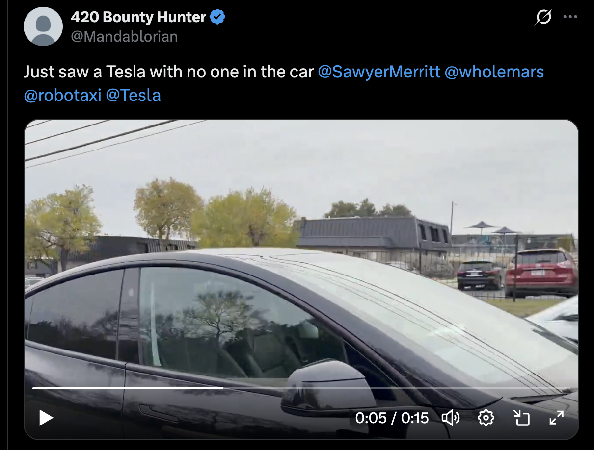 Interesting sighting of an unmarked Tesla (e.g. no Robotaxi logo on it) in Austin without any person inside https://x.com/Mandablorian/status/2000233715726008797