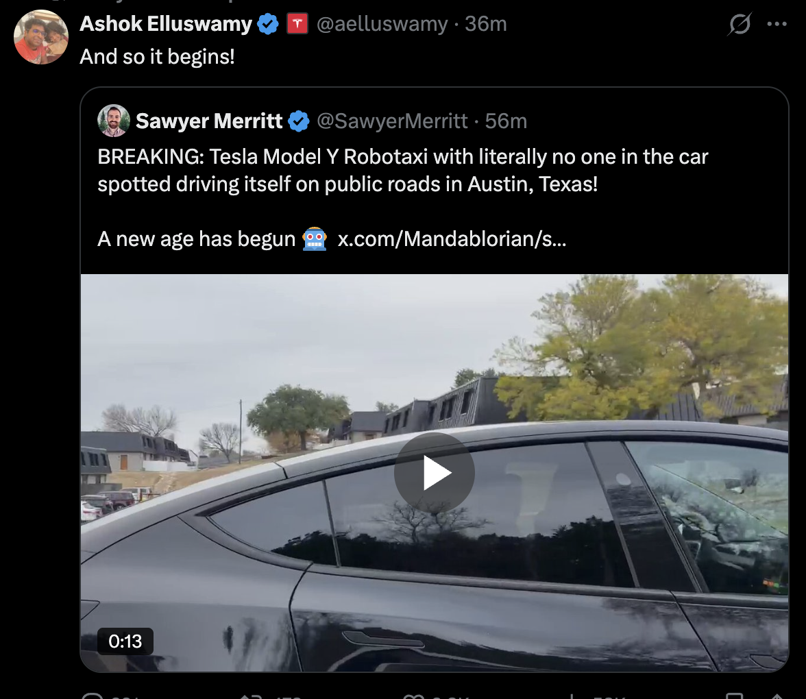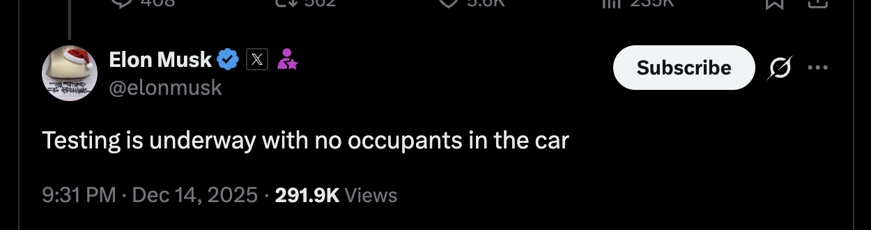 Or more to the point, this market is asking whether the Austin robotaxis this summer cracked unsupervised autonomy and Musk has been explicit that the answer was yes. I think this "on the cusp" and "within a few months" is a reversal.